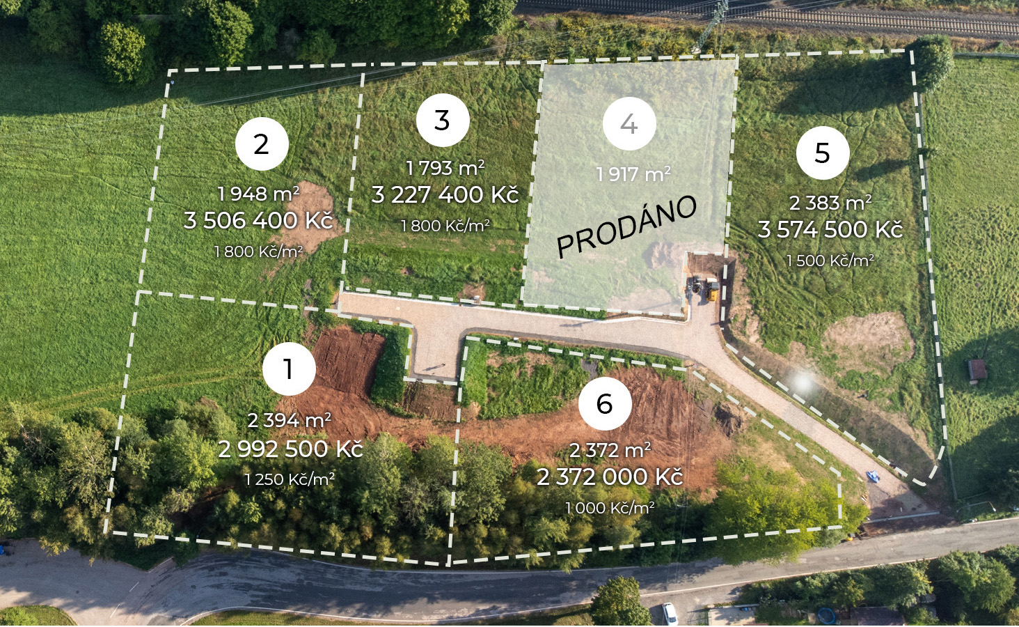 Šest stavebních pozemků nám tvoří obytný celek přístupný z hlavní ulice po obecní komunikaci. Pozemky jsou zařazeny v územním plánu obce pro výstavbu rodinného bydlení vesnického typu. Stavební povolení vydáno. Pozemky jsou mírně svažité, orientované na jihozápad. Zavedeny funkční elektropřípojky s elektroměrem, vodovod, kanalizace a zkolaudovaná nová příjezdová cesta.